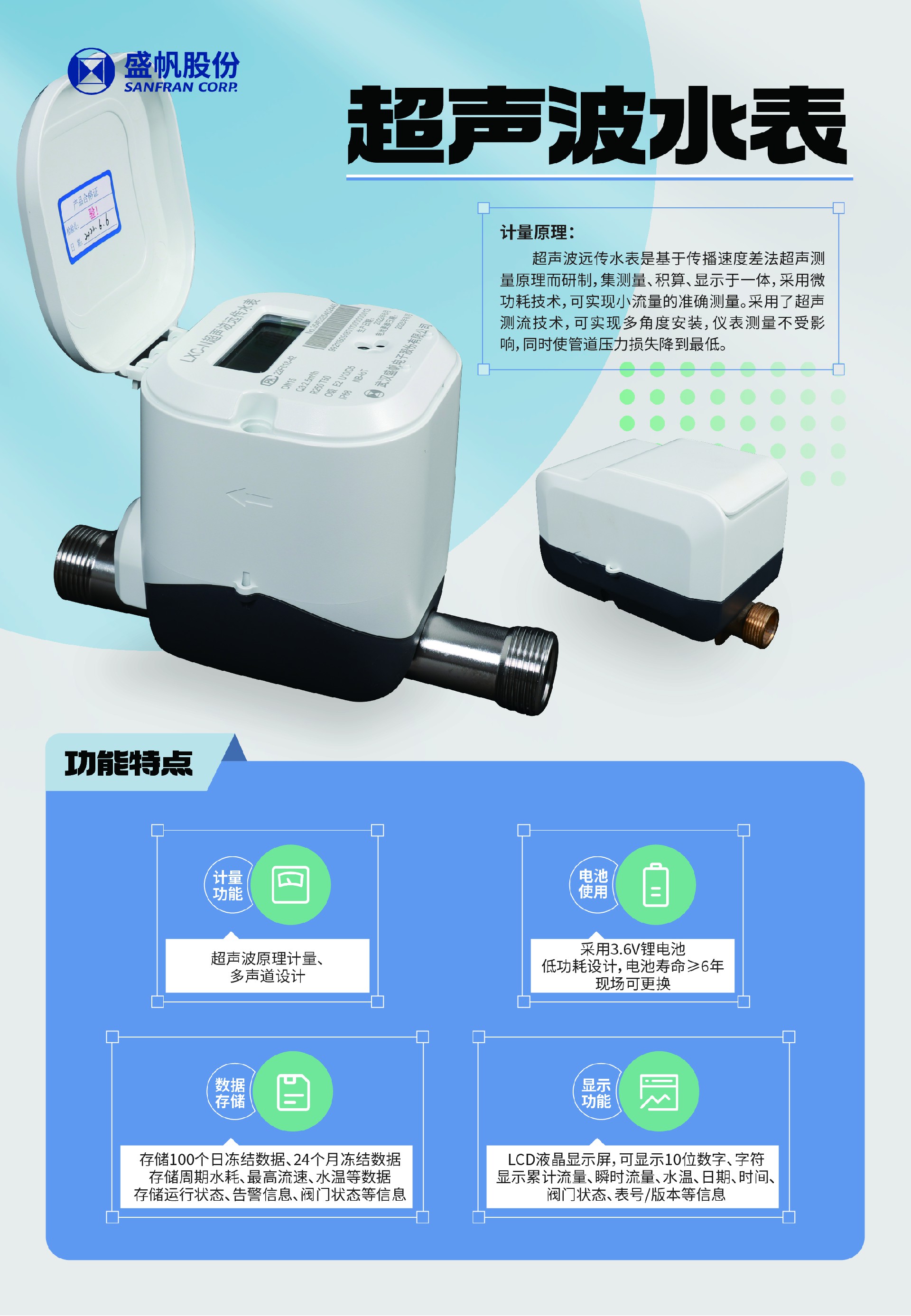 1、超声波原理计量、多声道设计;